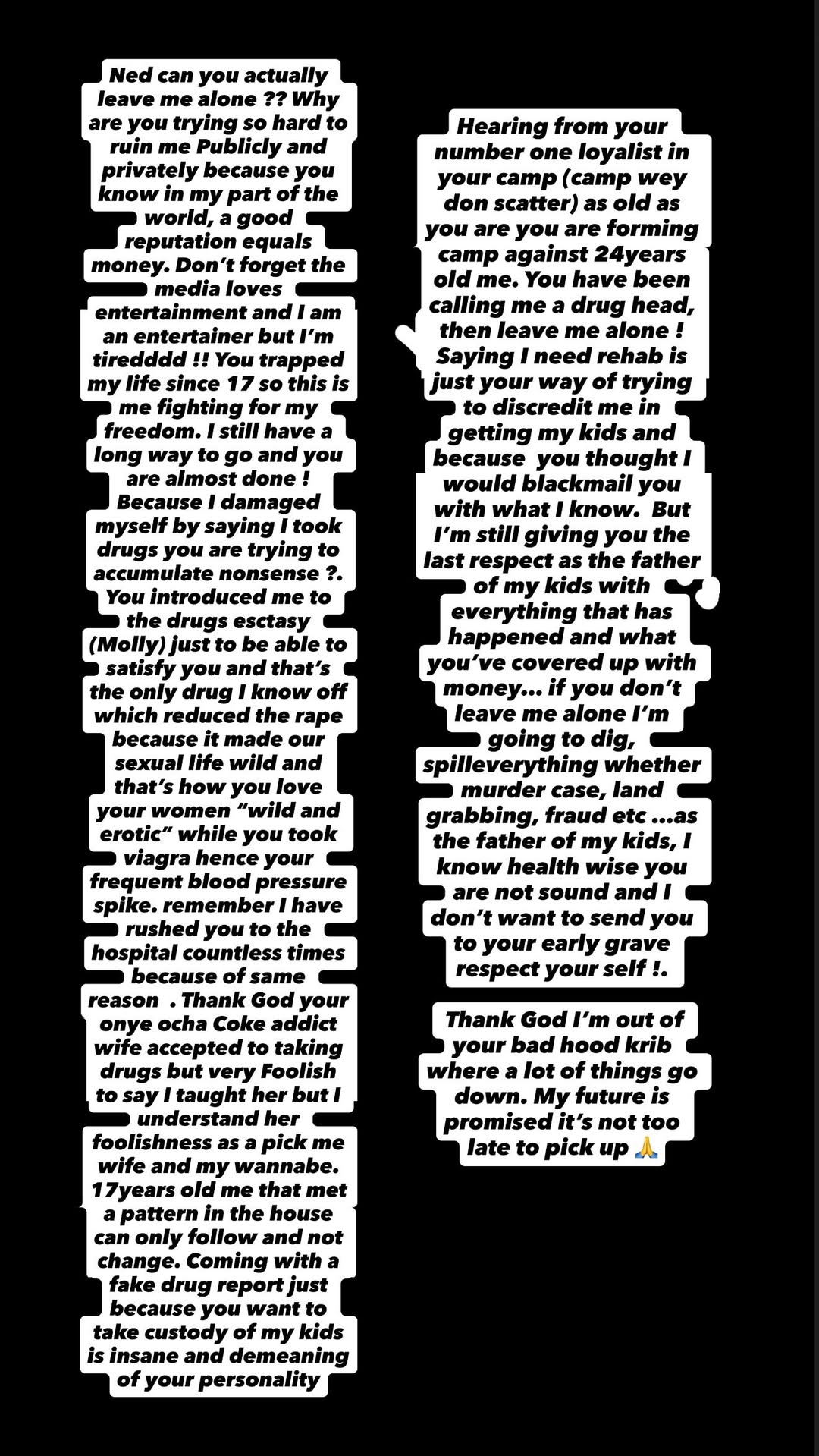 Her warning was clear: “If you don’t leave me alone I’m going to dig, spill everything whether murder case, land grabbing, fraud etc… as the father of my kids, I know health wise you are not sound and I don’t want to send you to your early grave respect your self!”