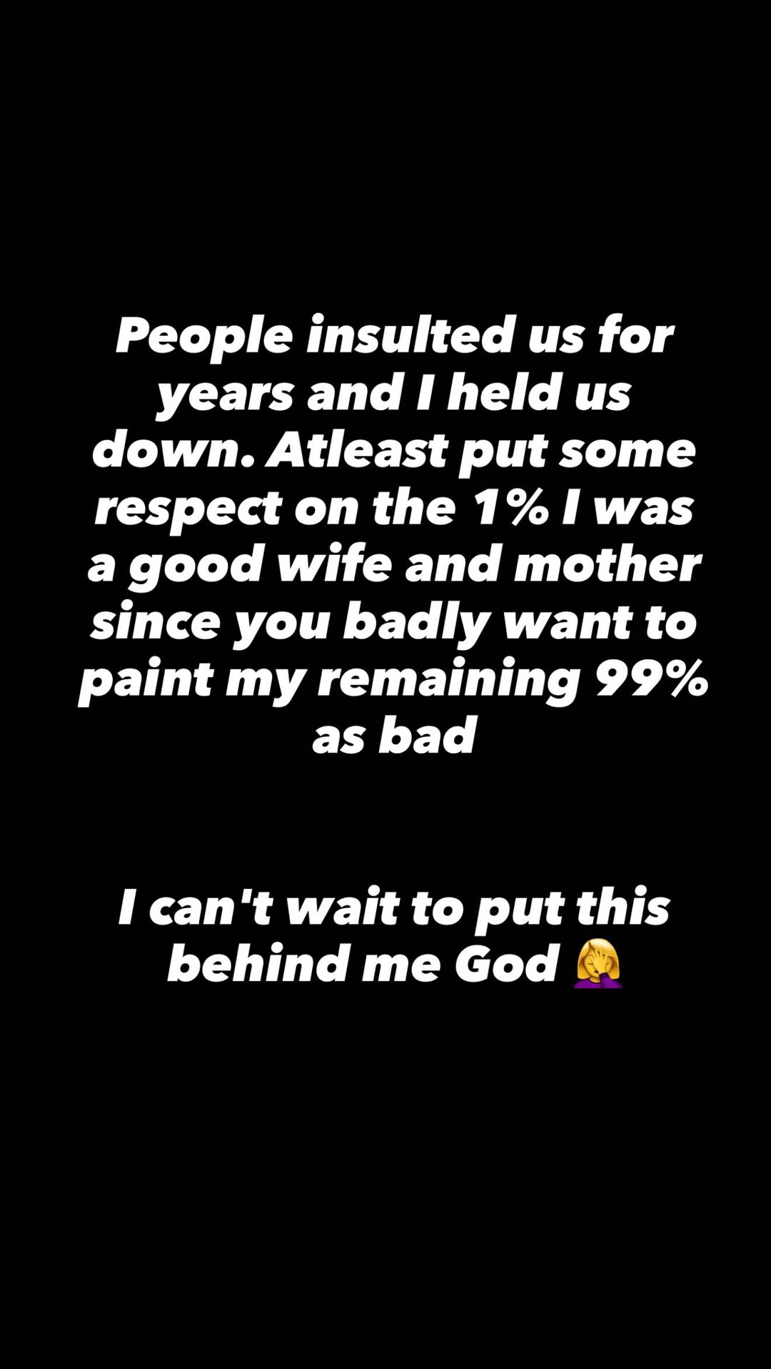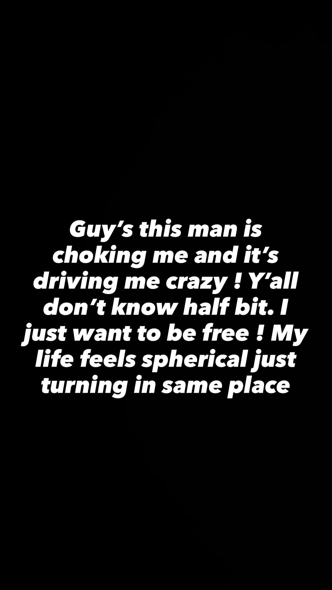 She wrote: “Guy’s this man is choking me and it’s driving me crazy! Y’all don’t know half bit. I just want to be free! My life feels spherical just turning in same place.”