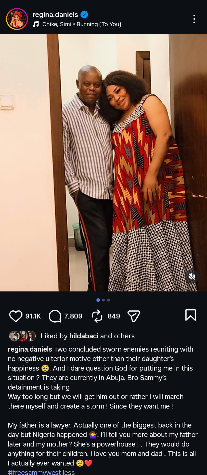 Regina Daniels has shared an emotional message celebrating her parents, Rita Daniels and Barrister Jude Ojegwu, after they reunited to work together for the release of her brother, Sammy West, who is still being detained allegedly on the orders of Senator Ned Nwoko.
