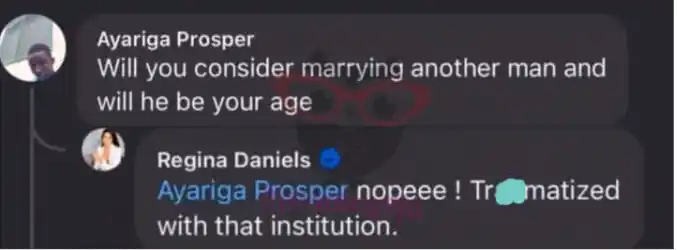 The actress, who recently separated from billionaire husband Ned Nwoko, said she remains deeply hurt and is not considering marriage again, especially with someone her age. Responding to a fan on social media, she wrote: “Nopeee traumatized with that institution.”