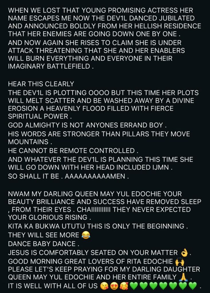 Rita, who has consistently defended May Yul Edochie and openly opposed Judy, countered with a lengthy message that left no doubt about who she was addressing. She began by praising May’s rise, saying: