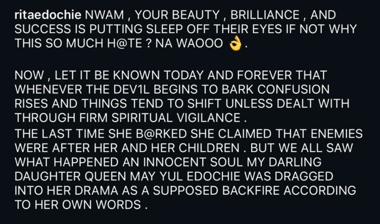 Rita, who has consistently defended May Yul Edochie and openly opposed Judy, countered with a lengthy message that left no doubt about who she was addressing. She began by praising May’s rise, saying: