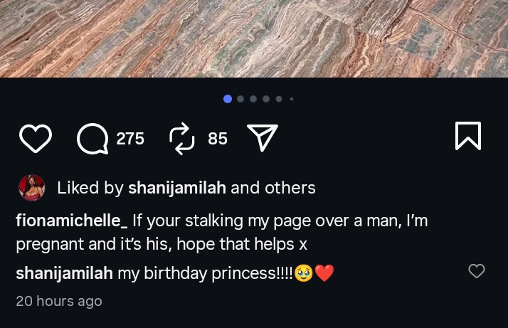 She wrote, “If you’re stalking my page over a man, I’m pregnant and it’s his. Hope that helps.”