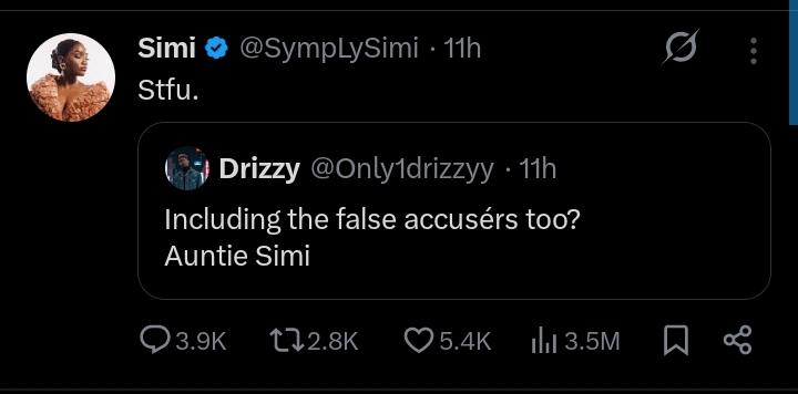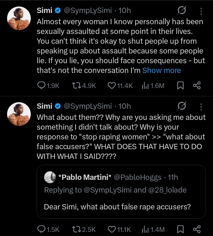 Some users challenged her stance, asking about false rape accusations. One asked, “Including the false accusérs too? Auntie Simi,” to which she bluntly replied, “Stfu.” Another user pressed further: “Dear Simi, what about false rape accusers?” She responded sharply: “What about them?? Why are you asking me about something I didn’t talk about? Why is your response to ‘stop raping women’ >> ‘what about false accusers?’ WHAT DOES THAT HAVE TO DO WITH WHAT I SAID????”