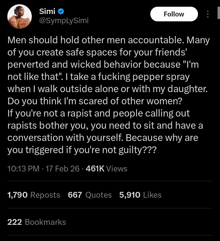 Simi later expanded on her remarks, explaining the personal experiences behind her frustration. She said almost every woman she knows has faced sexual assault, stressing that trying to silence survivors because of rare false accusations is unacceptable. “If you lie, you should face consequences—but that’s not the conversation I’m having. Nor is it one I’m interested in having,” she wrote. She urged men to hold other men accountable and highlighted the daily fears women face: “Women are terrified to go out. Women in their homes are not safe either. Ask your sisters. Ask your female friends and your girlfriends. Ask your wives. We’re not all crazy. STOP RAPING WOMEN!!”