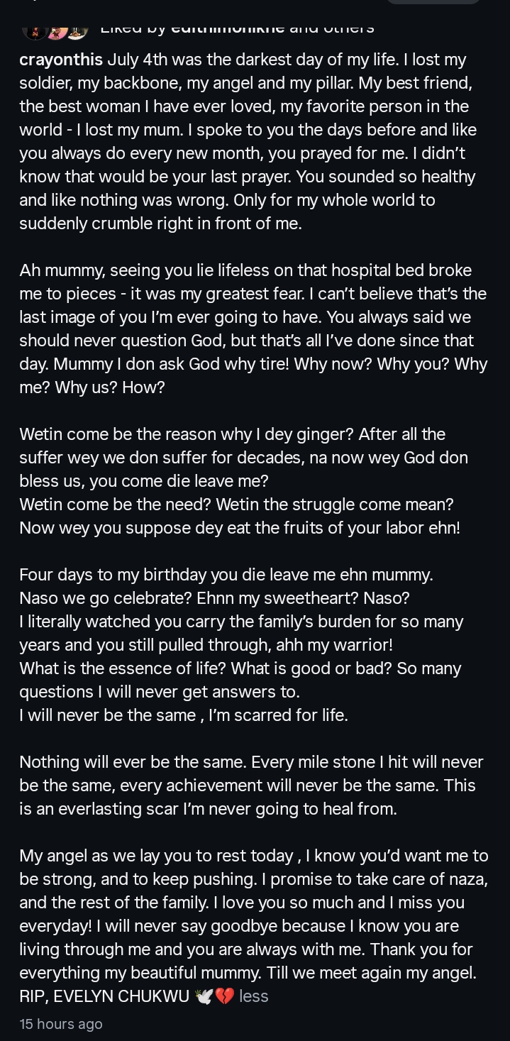 “Wetin come be the reason why I dey ginger? After all the suffer wey we don suffer for decades, na now wey God don bless us, you come die leave me? Wetin come be the need? Wetin the struggle come mean? Now wey you suppose dey eat the fruits of your labor ehn! Four days to my birthday you die leave me ehn mummy. Naso we go celebrate? Ehnn my sweetheart? Naso? I literally watched you carry the family’s burden for so many years and you still pulled through, ahh my warrior! What is the essence of life? What is good or bad? So many questions I will never get answers to. I will never be the same, I’m scarred for life.”