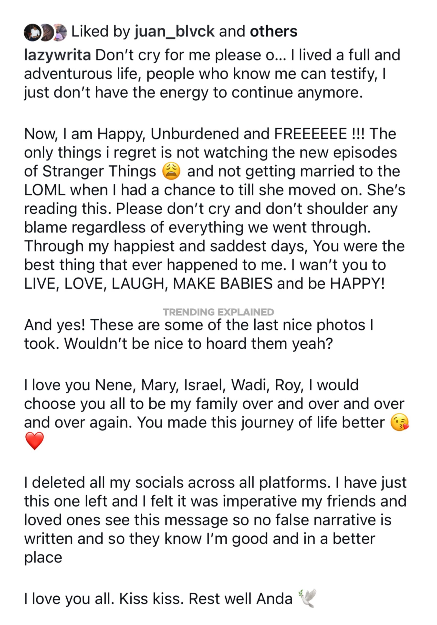 In the post, lazywrita urged friends and followers not to mourn excessively or blame themselves, describing a life filled with adventure but weighed down by exhaustion.