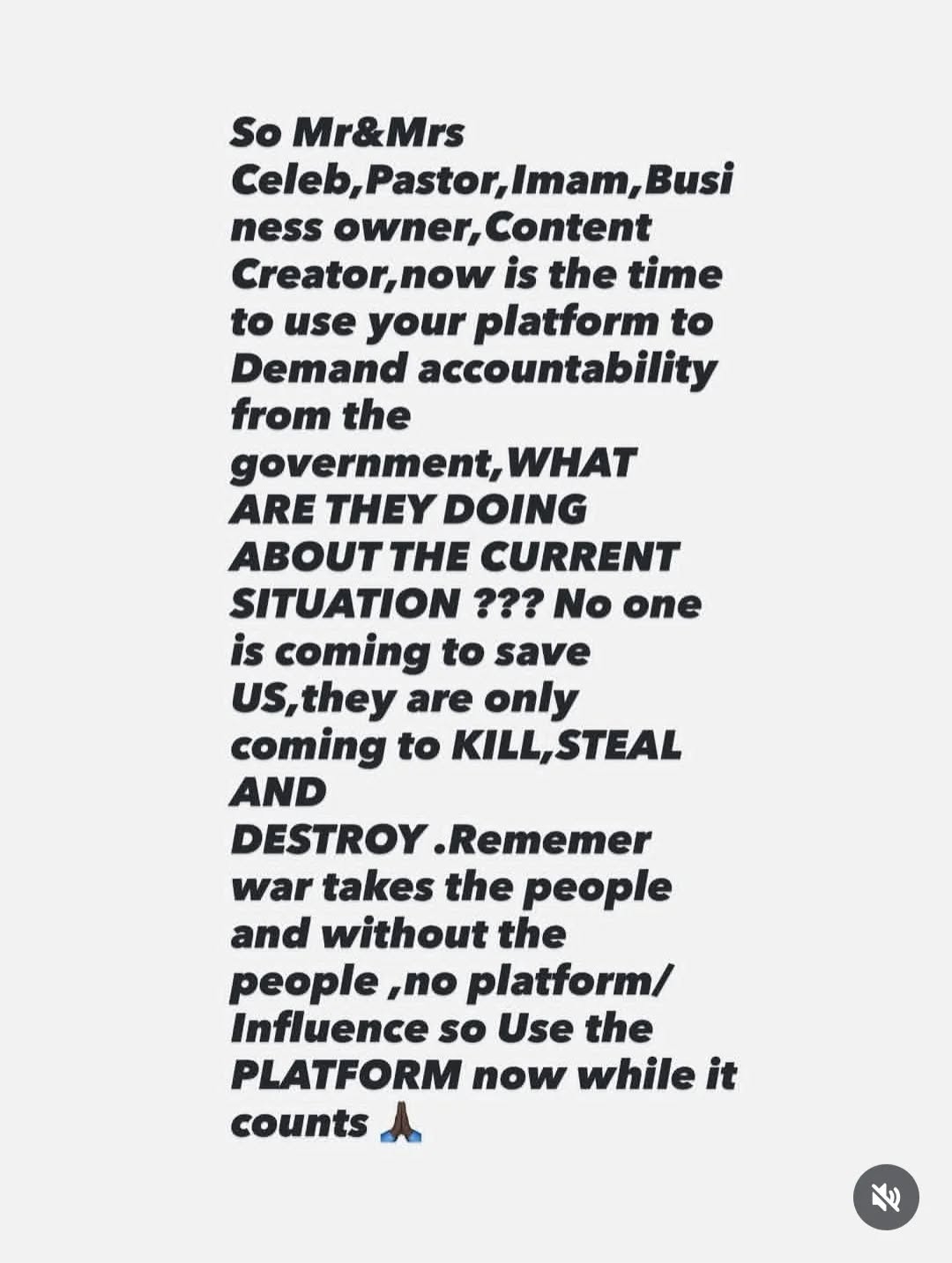 “I know it looks like a savior is coming, but the Devil always disguises as an angel of light; his actual aim is to STEAL, KILL & DESTROY. What better time to use our platforms than now to demand that the government do the necessary to avoid this DANGER LOOMING,” he wrote.