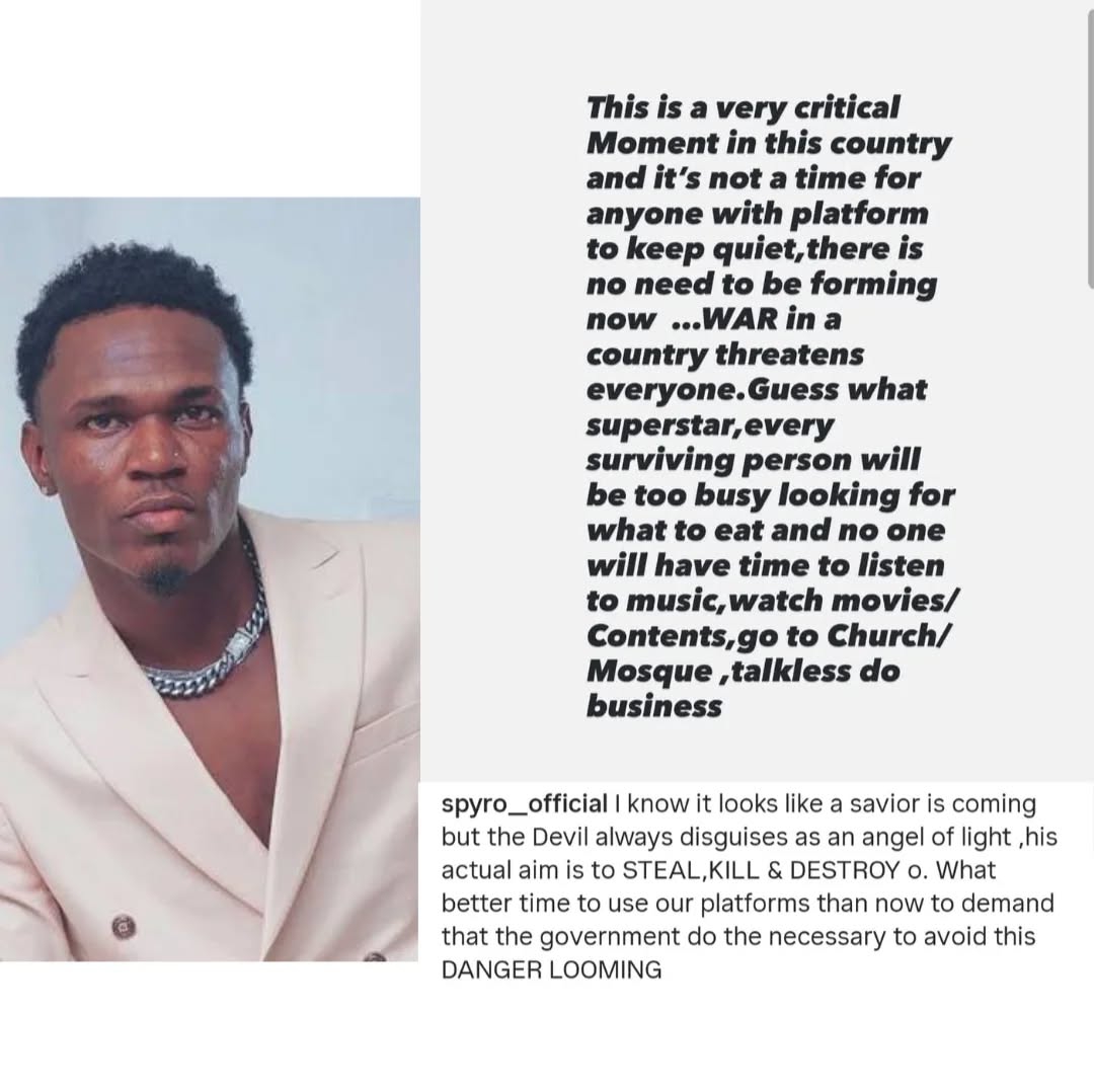 Taking to Instagram, Spyro described the moment as critical, saying that conflict affects everyone and would leave citizens struggling to survive, with no time for music, movies, worship, or business.