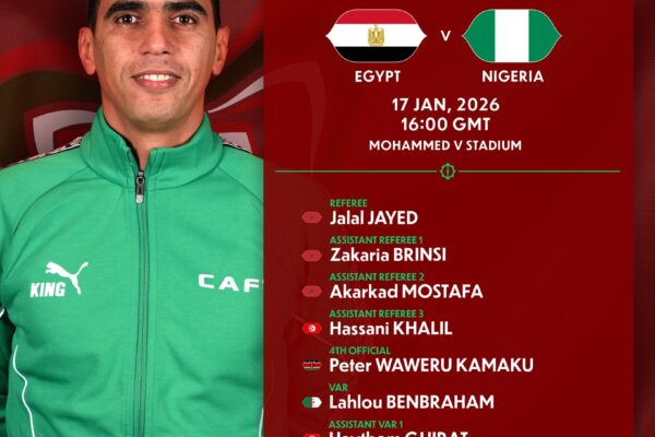 The Confederation of African Football has appointed Moroccan official Jalal Jiyed to take charge of today’s third-place playoff at the 2025 Africa Cup of Nations between Nigeria’s Super Eagles and Egypt’s Pharaohs. The encounter will take place at the Mohammed V Stadium in Casablanca, with kick-off set for 5 pm WAT, as both teams look to close their AFCON campaigns on a positive note after falling short of the final. Jiyed will be assisted by Zakaria Brinsi, Akarkad Mostafa and Hassani Khalil, while Peter Waweru Kamaku will serve as the fourth official. The video assistant referee team will be led by Algeria’s Lahlu Benbraham, alongside Haythem Guirat and Hamza El Fariq. Sinko Zeli has been assigned as referee assessor for the penultimate game of the tournament. Nigeria head into the playoff following a heartbreaking semi-final loss to hosts Morocco, where the Super Eagles were beaten on penalties after an intense contest. Egypt also narrowly missed out on a final spot, suffering a 1-0 defeat to reigning champions Senegal. Super Eagles coach Eric Chelle has stressed the importance of ending the tournament with pride and momentum, while Egypt’s Hossam Hassan sees the match as an opportunity to secure a podium finish and rebuild confidence.