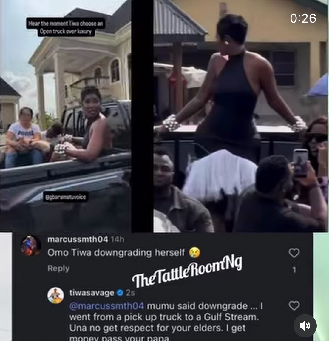 The singer fired back with a sharp reply: “@marcussmth04 mumu said downgrade… I went from a pick-up truck to a Gulf Stream. Una no get respect for your elders. I get money pass your papa.”