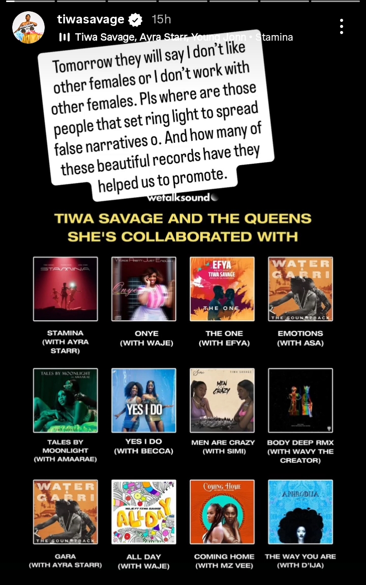 Tiwa Savage has responded to ongoing claims that she doesn’t support or collaborate with other female artistes, backing her response with proof.