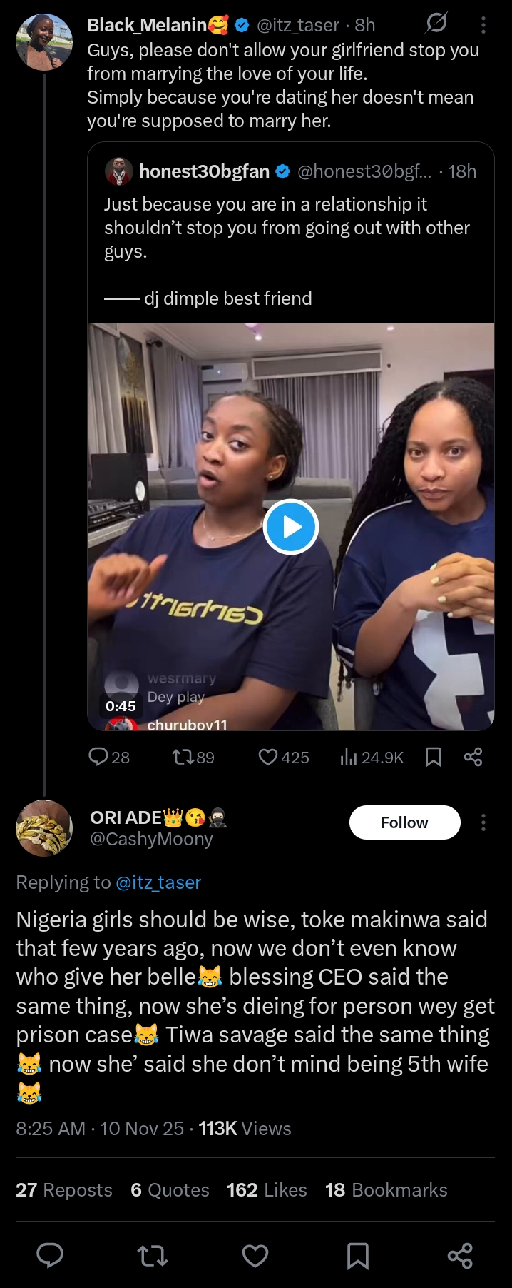 “Nigerian girls should be wise. Toke Makinwa said that a few years ago, now we don’t even know who gave her belle 😹 Blessing CEO said the same, now she’s involved with someone with a prison case 😹 Tiwa Savage said the same 😹 now she says she doesn’t mind being a fifth wife 😹”