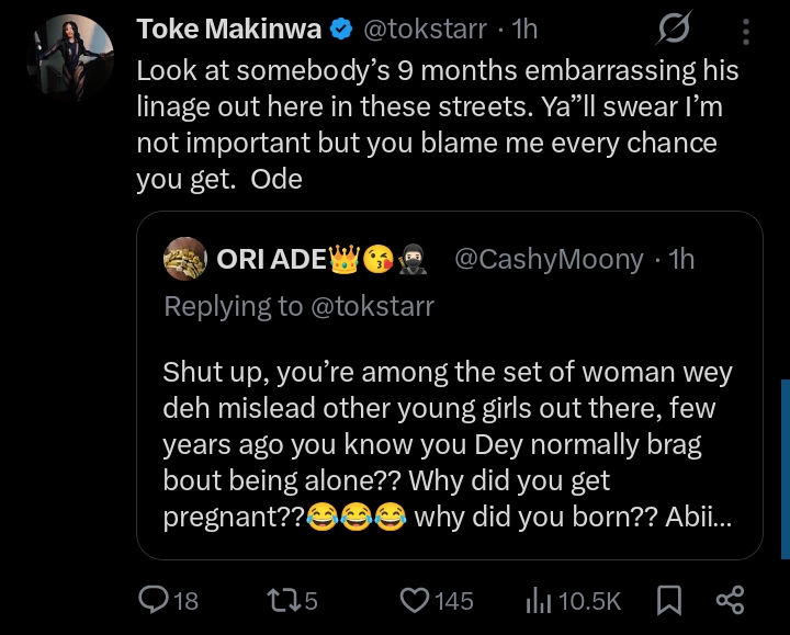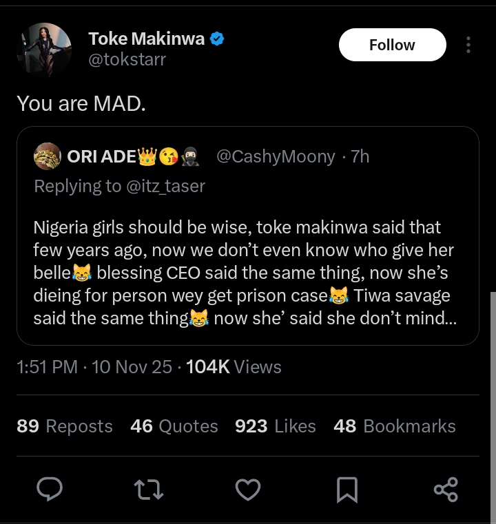Toke Makinwa’s response was short and firm: “You are MAD.”