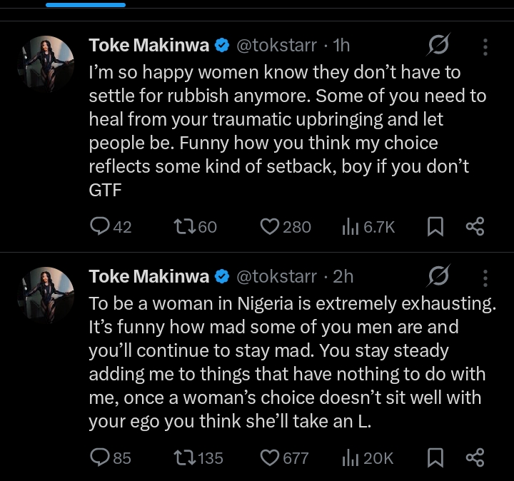 “To be a woman in Nigeria is extremely exhausting. It’s funny how mad some of you men are and you’ll continue to stay mad. You stay steady adding me to things that have nothing to do with me. Once a woman’s choice doesn’t sit well with your ego, you think she’ll take an L. I’m so happy women know they don’t have to settle for rubbish anymore. Some of you need to heal from your traumatic upbringing and let people be. Funny how you think my choice reflects some kind of setback, boy if you don’t GTF.”