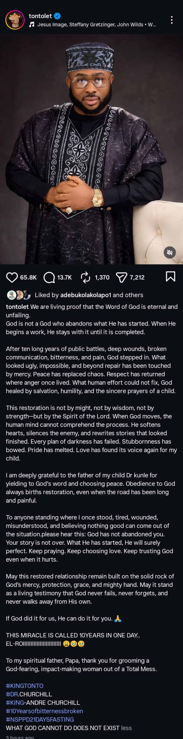 Nollywood actress and philanthropist Tonto Dikeh has announced a surprising reconciliation with her ex-husband, Olakunle “Churchill” Oladunni, describing the reunion as a “divine restoration” after nearly a decade of public disputes and legal battles.