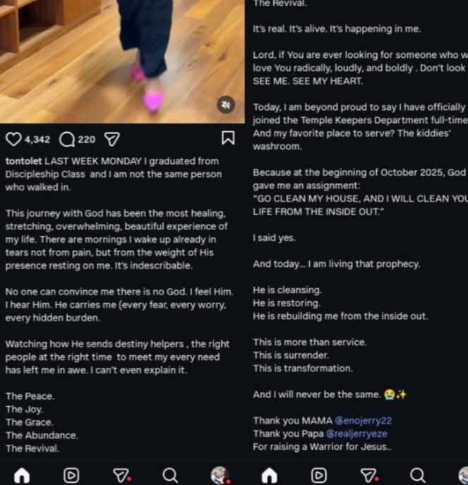 Tonto also revealed that she now serves full-time in the Temple Keepers Department, joking that her favourite duty post is the children’s washroom. She recounted the divine instruction she received in October 2025: “GO CLEAN MY HOUSE, AND I WILL CLEAN YOUR LIFE FROM THE INSIDE OUT.”