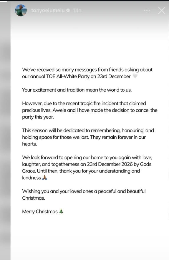 Tony Elumelu and his wife, Awele, have cancelled this year’s TOE All-White Party, which was set for December 23. He announced the decision on Instagram, explaining that the celebration will not hold in light of the recent fire tragedy that claimed several lives.