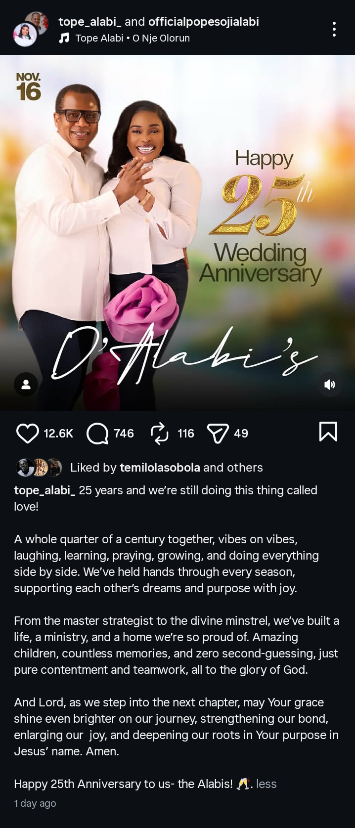 She concluded her message with a prayer: “Lord, as we step into the next chapter, may Your grace shine even brighter on our journey, strengthening our bond, enlarging our joy, and deepening our roots in Your purpose. Amen. Happy 25th anniversary to us—the Alabis!”