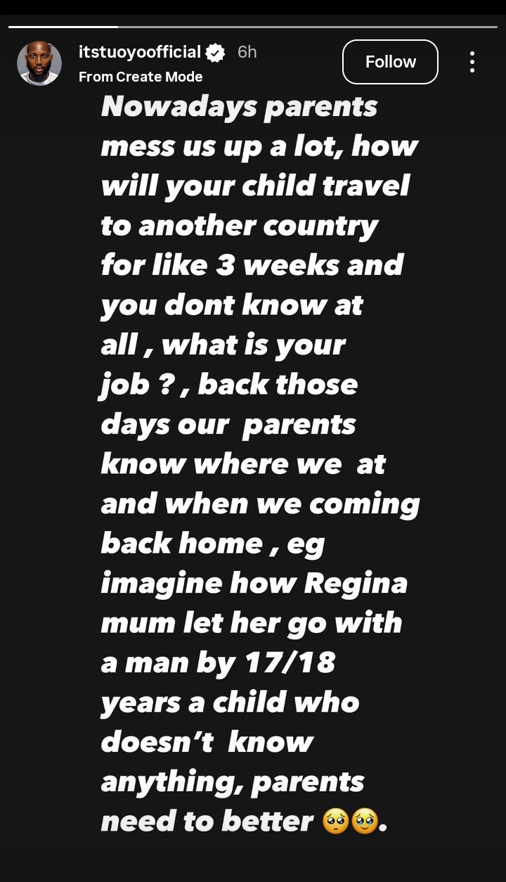 In an Instagram story, Tuoyo questioned how Regina’s mother could have allowed her daughter, then only 17 or 18 years old, to marry a significantly older man and even travel abroad without proper supervision.
