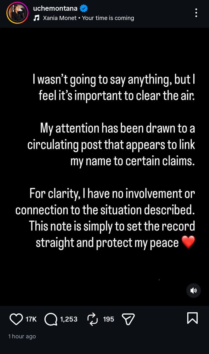“I wasn’t going to say anything, but I feel it’s important to clear the air. My attention has been drawn to a circulating post that appears to link my name to certain claims. For clarity, I have no involvement or connection to the situation described. This note is simply to set the record straight and protect my peace.”