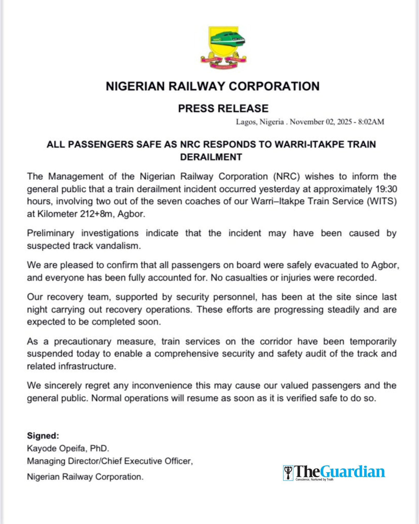 NRC Managing Director Kayode Opeifa confirmed that all passengers were safely evacuated and accounted for, with no injuries reported. “All passengers on board were safely evacuated to Agbor, and everyone has been fully accounted for. No casualties or injuries were recorded,” he said.