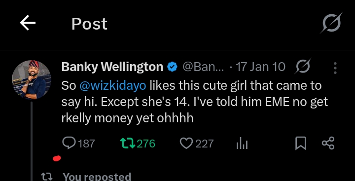 Banky W, Wizkid’s former record label boss at E.M.E, was also drawn into the discussion. He reportedly reacted to the alleged posts, writing: “So @wizkidayo likes this cute girl that came to say hi. Except she’s 14. I’ve told him EME no get rkelly money yet ohhhh.”