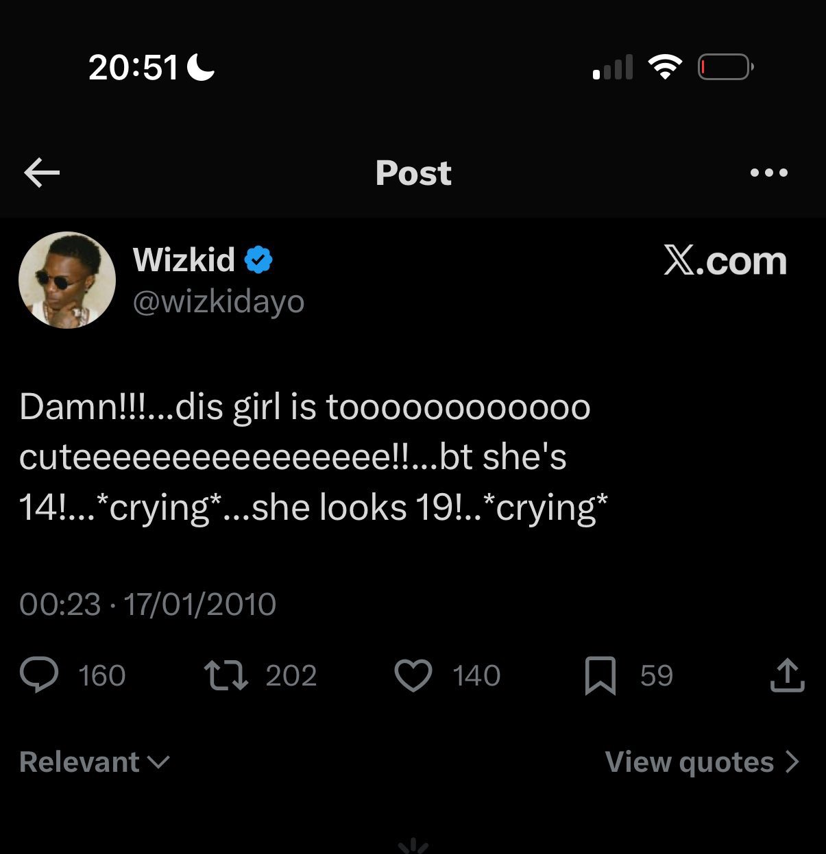 Old tweets allegedly from Wizkid praising a 14-year-old girl have once again gone viral, shaking social media and sparking heated debates among fans and critics. Screenshots circulating online claim the singer made remarks about the girl’s looks that many have called inappropriate.
