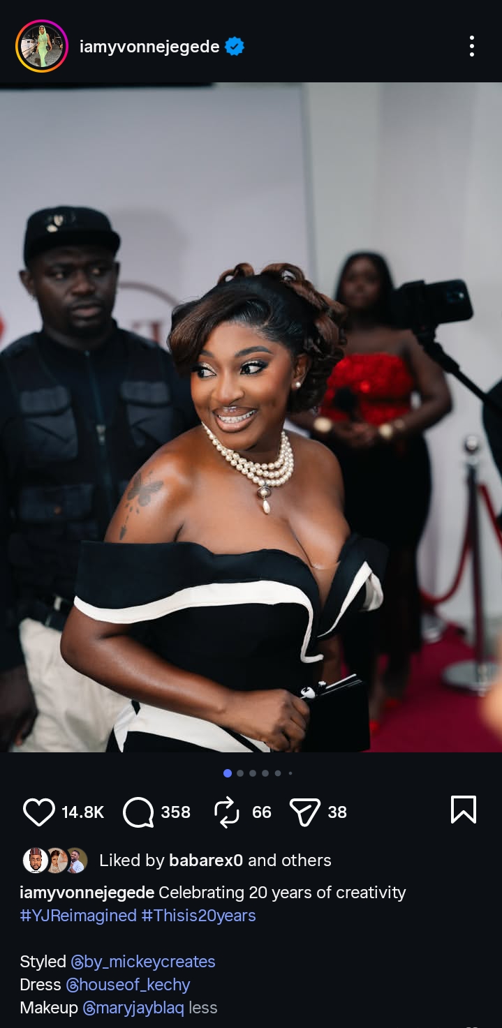 The actress took to social media to commemorate her two decades in Nollywood, sharing a series of breathtaking photos from her career and personal life. She captioned the post: “Celebrating 20 years of creativity #YJReimagined #Thisis20years.”