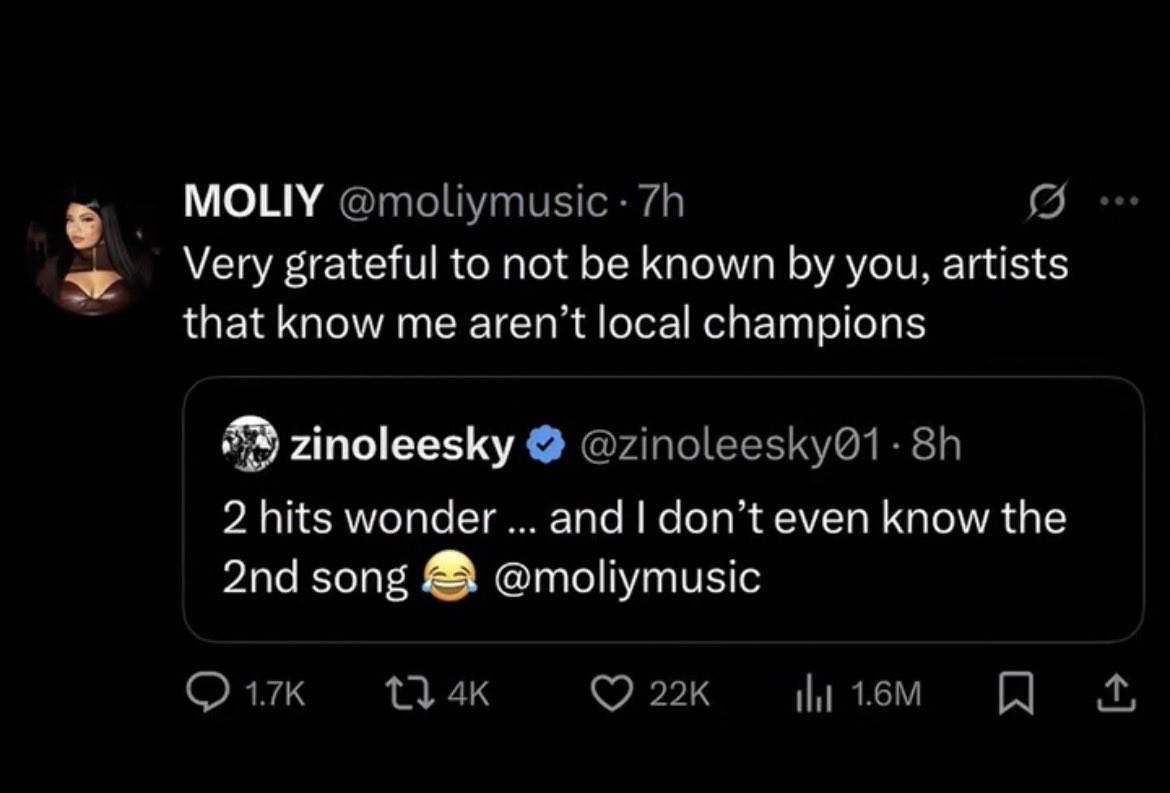 Moliy fired back sharply, seemingly taking aim at Zinoleesky’s influence, tweeting: “Very grateful to not be known by you, artists that know me aren’t local champions.”